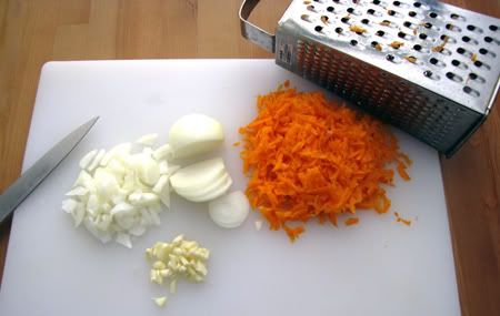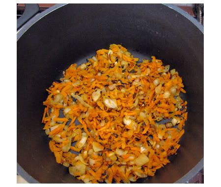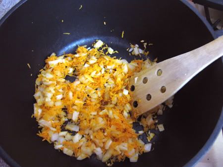 מחממים סיר עם תחתית עבה ומוסיפים אליו כף שמן קנולה. קוצצים את הבצל והשום ומעבירים לסיר לטיגון קצר עד שהבצל מתחיל להזהיב.