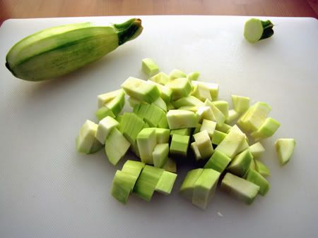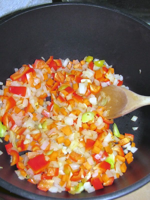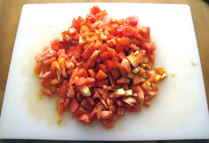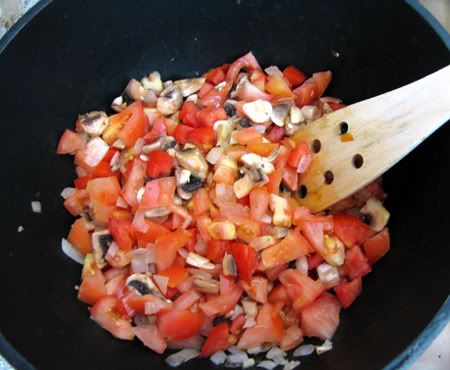 בינתיים, חותכים לקוביות את העגבניות והפטריות ומעבירים גם כן לסיר עם הבצל.