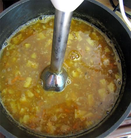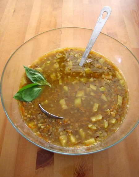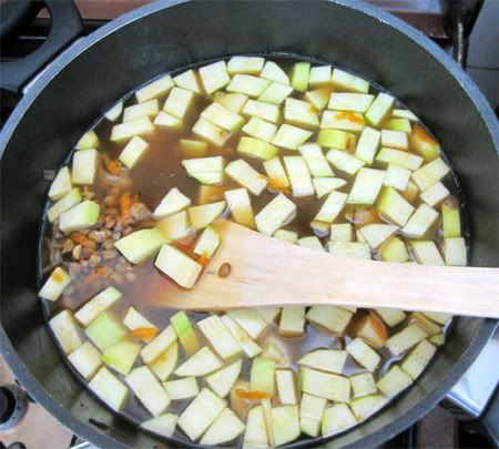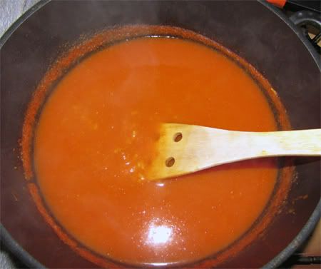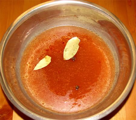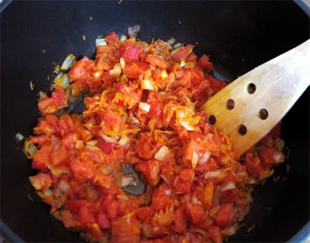 כאשר העגבניות מתחילות לאבד את הצורה ולהפוך לעיסתיות מוסיפים לסיר כוס מים רותחים מעורבבים בכף אבקת מרק.