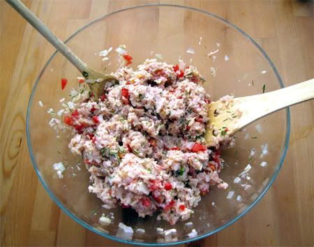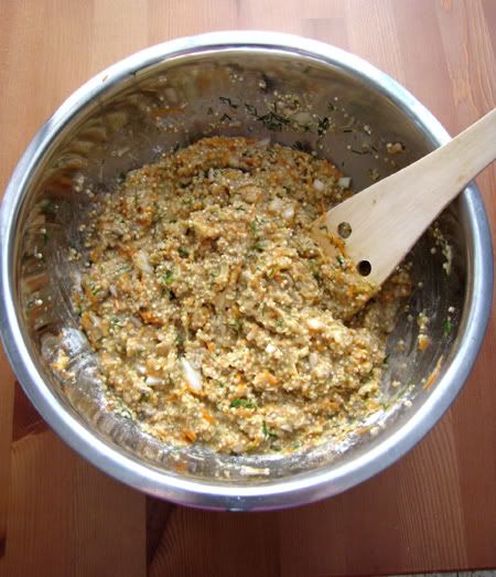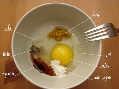 מערבבים את הכל לעיסה אחידה, אם העיסה נוזלית מידי, מוסיפים עוד כף פרורי לחם.