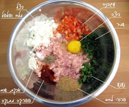 לקערה גדולה מעבירים את הבשר הטחון. קוצצים דק דק את הבצל והעגבניות (כמה שיותר דק יותר טוב) ומוסיפים לבשר.